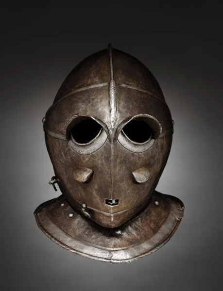 Специалисты из женевского музея истории и искусства называют подобные шлемы "савойскими армэтами" (armet savoyard). Экземпляр с фото из Германии XVII века. В Германии же такой шлем называют "Тоденкопф", что переводится как "череп смерти". Он был специально разработан для защиты от мощных колесцовых пистолетов и для того, чтобы пугать противников на поле боя. Внешний вид и необычная форма делали его поистине устрашающим.