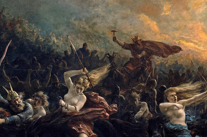 Сделал это и Арбо. У него процессию возглавляет Тор, судя по упряжке из козлов и молота в руке. Люди одетые в шкуры, очевидно берсерки (так как слово "берсерк" переводится как "медвежья рубашка"), человек с искривлённым мечом, похоже Сигурд (так как в некоторых источниках его меч Грам напоминал языки пламени).