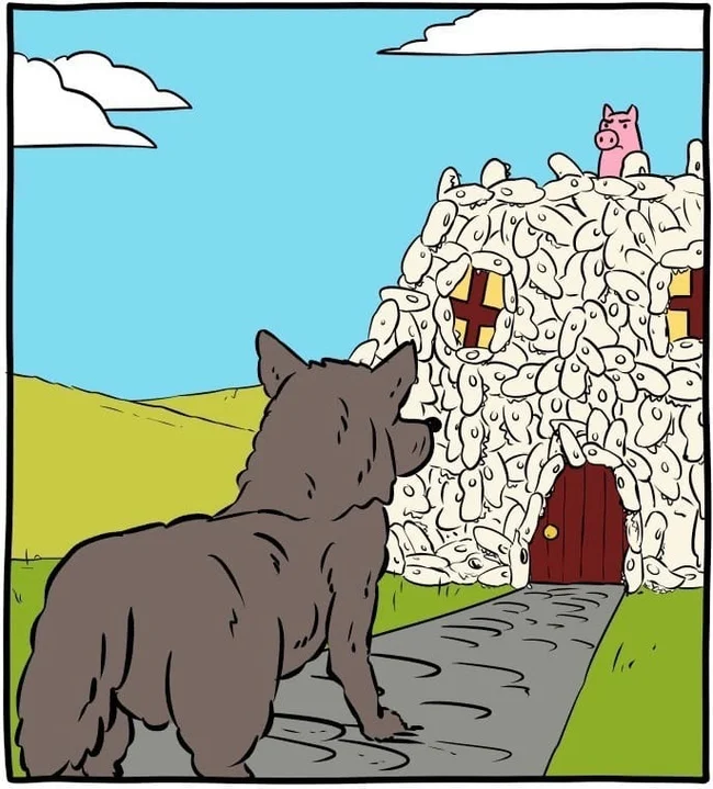 Дом четвёртогo поросёнка был поcтроен из волчьих черепов. Не особо надёжно, но зато доходчивo