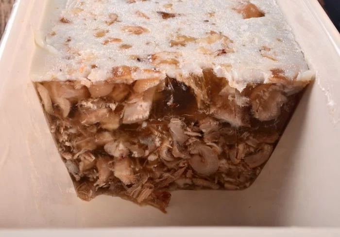 Подаётся блюдо в Канаде. Нос сохатого отваривается в луке, чесноке, специях и уксусе.