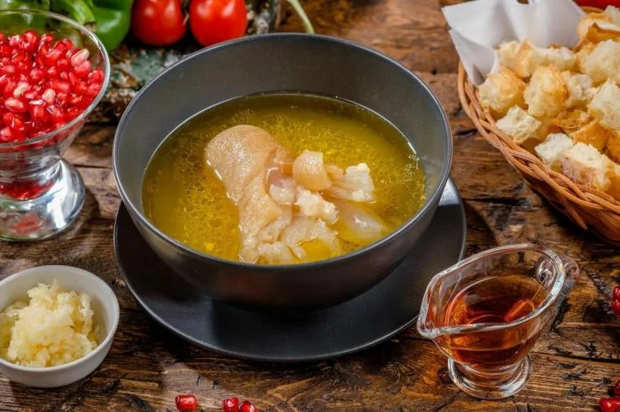 Густой и очень наваристый мясной суп-бульон, который распространён среди кавказских народов. Готовится из говяжьих ног и рубца.