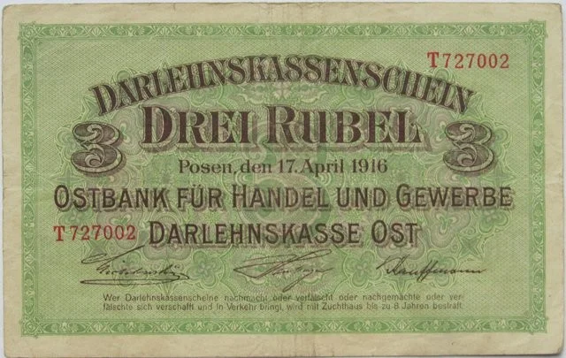 «Восточный рубль» печатался от имени Ostbank fur Handel und Gewerbe – Восточного торгово-промышленного банка, расположенного в Познани (тогда германский Позен). Во времена Второго рейха, почти до конца XIX века, банк выпускал свои марки и талеры, ходившие в Великом герцогстве Познанском – польских землях, подчиненных Берлину. Этот недавний опыт Остбанка практичные немцы использовали в ходе Первой мировой войны.