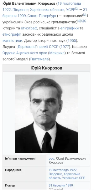 19 ноября 1922 года, 102 года назад, родился Юрий Кнорозов — исследователь, расшифровавший письменность майя.