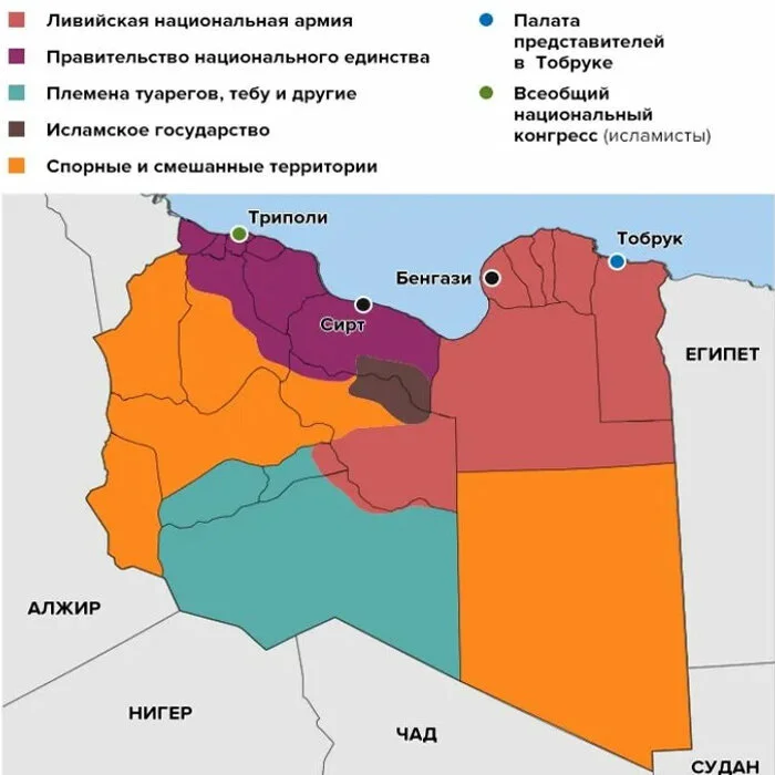 Сейчас Ливия фактически представляет собой распавшееся государство, разделённое между различными политическими и военизированными группировками.