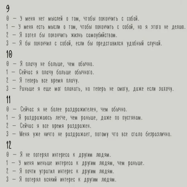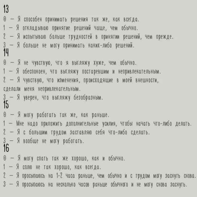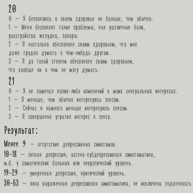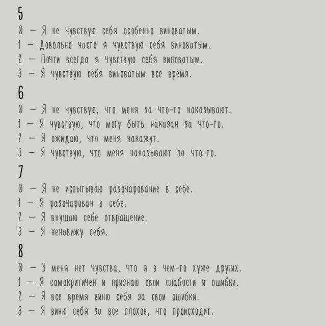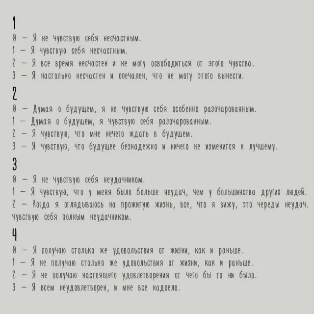 Перед нами шкала Бека, по которой можно легко определить, есть ли у вас депрессия. Всего-то нужно ответить на несколько вопросов.