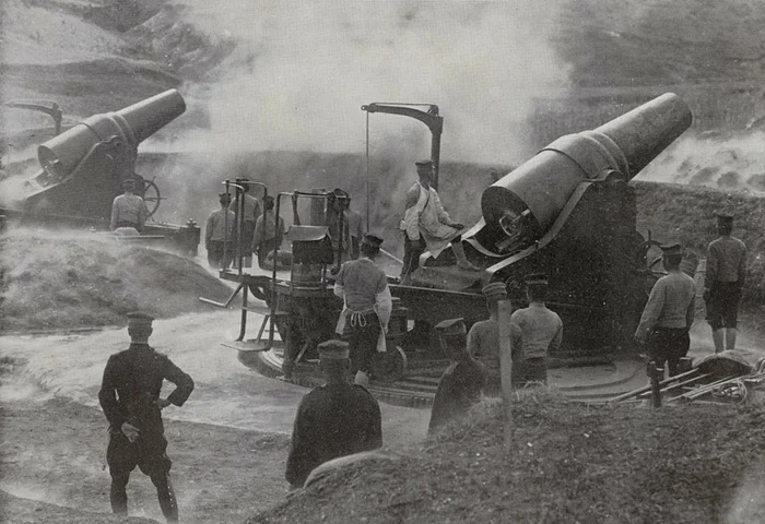 А на суше в полевой артиллерии… Ах да, тут надо сперва сказать про русскую артиллерию: в боекомплект наших новых 76-мм пушек обр. 1900 г. фугасных боеприпасов не было, а к 87-мм обр. 1877/95 гг. были устаревшие типа, со слабым фугасным действием. Поэтому без привлечения более тяжёлых орудий, которых было не так много, наши не могли выбить японцев даже из дендрофекальных (причём названия материалов даю без иронии) домиков. А вот японские 75-мм пушки (а у них ещё хватало новейших полевых гаубиц) вполне себе могли накидывать снарядами с шимозой с красивыми эффектами — даже от 75-мм снаряда вздымалось 5-метровое облако пыли и коричневатого или тёмно-зелёного дыма, звук был резким. Наши бойцы, не сталкивавшиеся ранее с полноценными фугасами и плотной осыпью мелких осколков, были шокированы японской новинкой.