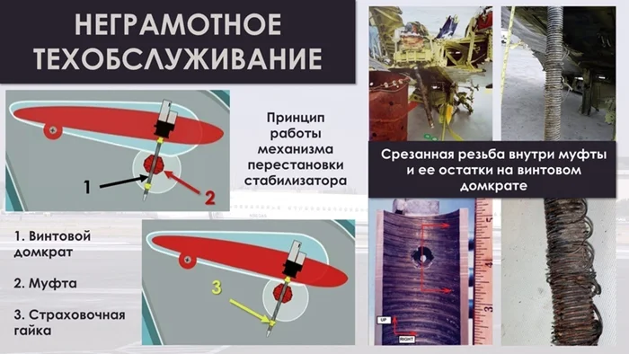 Расследование показало, что причиной крушения стал отказ механизма перестановки стабилизатора. Из-за халатности службы по техобслуживанию, которая самостоятельно увеличила интервалы между осмотрами, на винтовом домкрате не было смазки, поэтому резьба внутри муфты стерлась и механизм работал вхолостую.