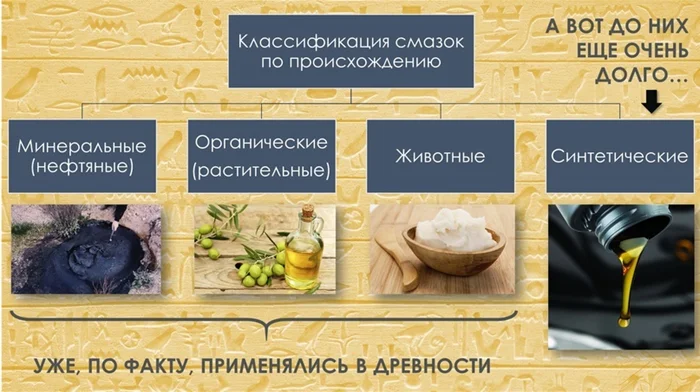 Соответственно мы можем даже раскидать известные нам древние смазки по этой классификации: битум – минеральная смазка, оливковое масло - растительная, сало и жир – животная, а до синтетических еще ждать и ждать.