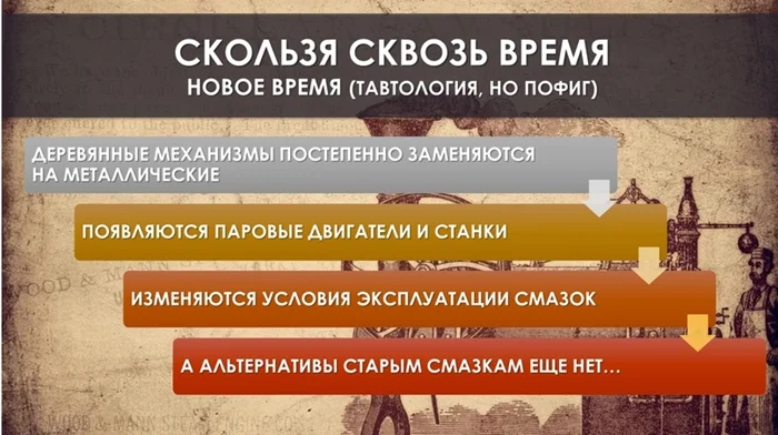 Теперь мы уйдем от науки и вернемся к исторической точке зрения. Дело в том, что какой-то момент существующие составы смазок перестали отвечать необходимым требованиям. Что могло пойти не так? Началась индустриальная революция.