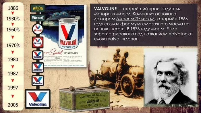 Короче, прорыв случился! И вот уже на рынке появляются первые минеральные масла, такие необходимые для промышленности. На картинке внизу как раз отец коммерческой минеральной смазки - Джон Эллис. Вообще изначально он был американским врачом, но вынашивал идею высоковязкого лубриканта для паровых двигателей. Он основал компанию непрерывной нефтепереработки в США, а год спустя разработал цилиндрическое масло на нефтяной основе, которое назвал Valvoline или валволин – от слова valve, клапан. Масло было настолько качественным, что 50 лет спустя Valvoline стало первым маслом, рекомендованным Ford Motor Company для автомобилей Ford Model T.