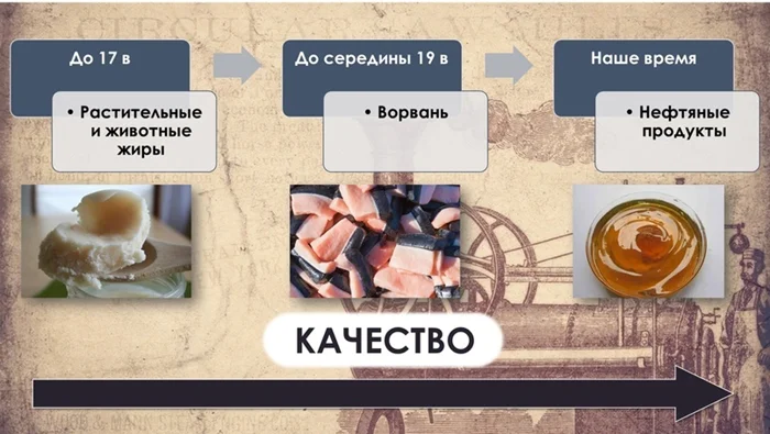 Исторические итоги: мы в сжатой сдвгшной форме пролетели от использования растительных и животных масел до нефти и искусственного масла. Отметили несколько важных точек, например, переход на жир китов, потом на минералку, а потом и открытие синтетики.