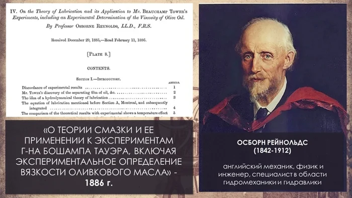 Эта статья по сути заложила основу теории гидродинамической смазки. Стоит сказать, что в нашей литературе основоположником теории принято считать русского ученого Петрова, но скорее всего их выкладки были сделаны независимо друг от друга.
