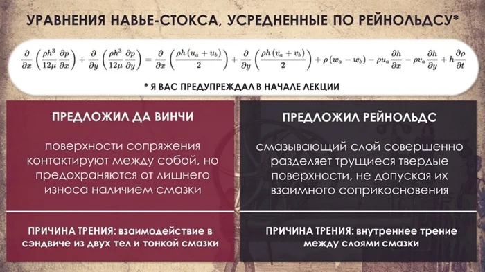 По сути в этой статье Рейнольдс впервые рассматривал смазку, как отдельный объект исследования. На основании уравнений Навье-Стокса (вы возможно знаете, что они являются одной из 7 неразрешимых математических задач тысячелетия) он сформулировал свое уравнение Рейнольдса, которое вы видите на слайде. Я прекрасно понимаю, что сейчас из-за этого слайда половина людей выйдет на перекур и не вернется (а читатели закроют лонг), но все-таки позвольте мне объяснить.
