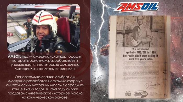 Так вот, пилоты тоже не дураки были, они приметили, что у самолетов масло зашибись, а почему бы его не сп*здить. Совсем немного, слить отработку и залить себе в автомобили. Вот вам один из таких гениальных людей – командир эскадрильи воздушной гвардии Миннесоты Эл Аматтуцио. Чем он нам интересен, так это тем, что не только заливал синтетику в машину, но и изучал ее, чтобы впоследствии адаптировать под автомобильный рынок. А потом забабахал первую коммерческую стопроцентно синтетическую смазку Амсоил. (Amzoil).