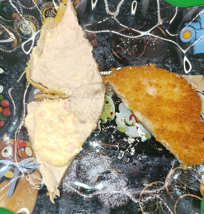 Когда я его разрезала, то подумала что продукт недожарен, потому что на меня полезла эта жидкая масса. Но оказалось, что производители решили не класть внутрь кусок сыра и ветчины, как положено, а просто захотели удивить покупателя и смешали всё в кашу, хотя на упаковке нарисован правильный вариант подачи. Сама котлета неплохая, вполне съёдобна, особенно корочка зажаренная радует, но если не заглядывать во внутрь. Съесть можно, но непонятно что хотел сказать автор повар.