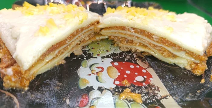 Даже четыре слоя! Но каких... тесто толстое и липкое, как в пельменях, внутри курица мех обвалки перемолотая в труху и залитая томатной пастой, хотя она здесь нужна чтобы убрать вкус фарша. Теста много, фарш растекается, но попадаются куски жаренного лука. Как будто это лазанья, которую выдаёт государство, не советую.