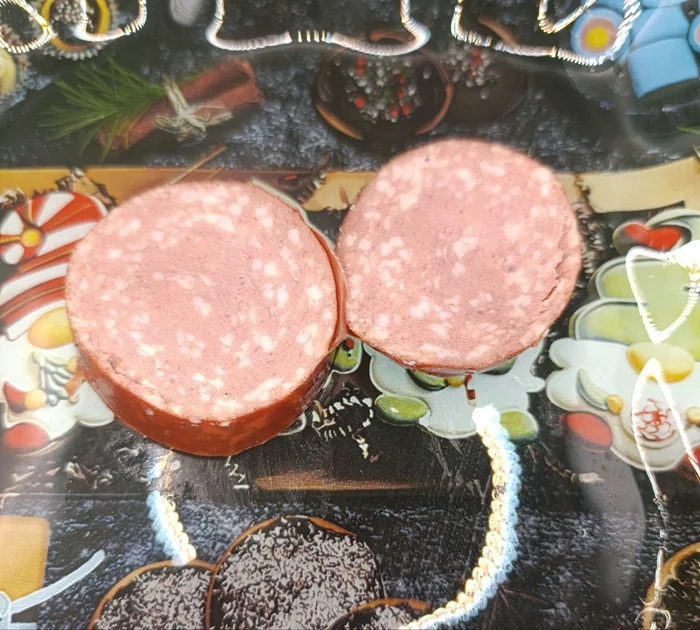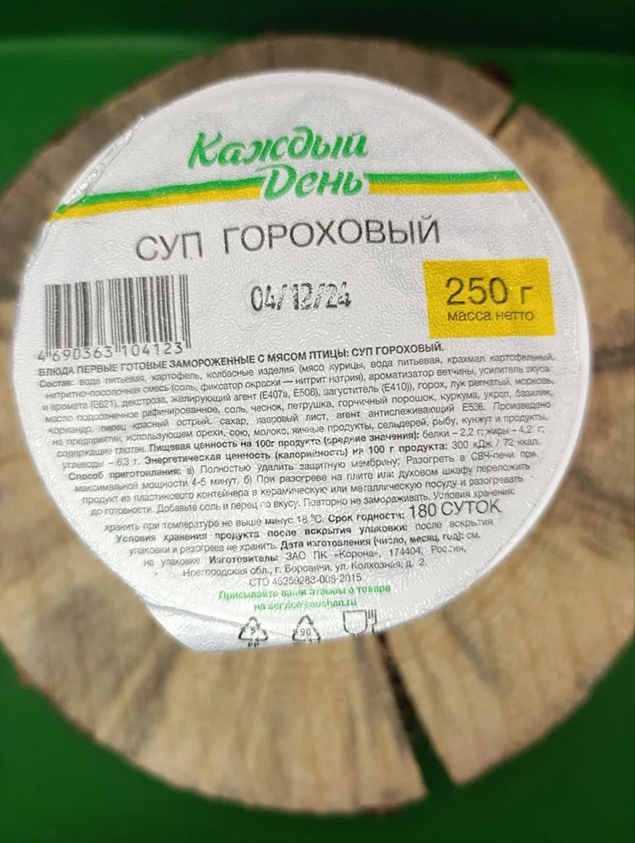 А знаете что, это не ужасно, горох чувствуется, сам суп приятный по специям сбалансированный, такой лёгкий ненавязчивый продукт, если бы не "мясо". В составе написано что это колбасное изделие, но выглядит как кошачий корм или продукт из сои. Съесть можно при желании, но лучше не надо.