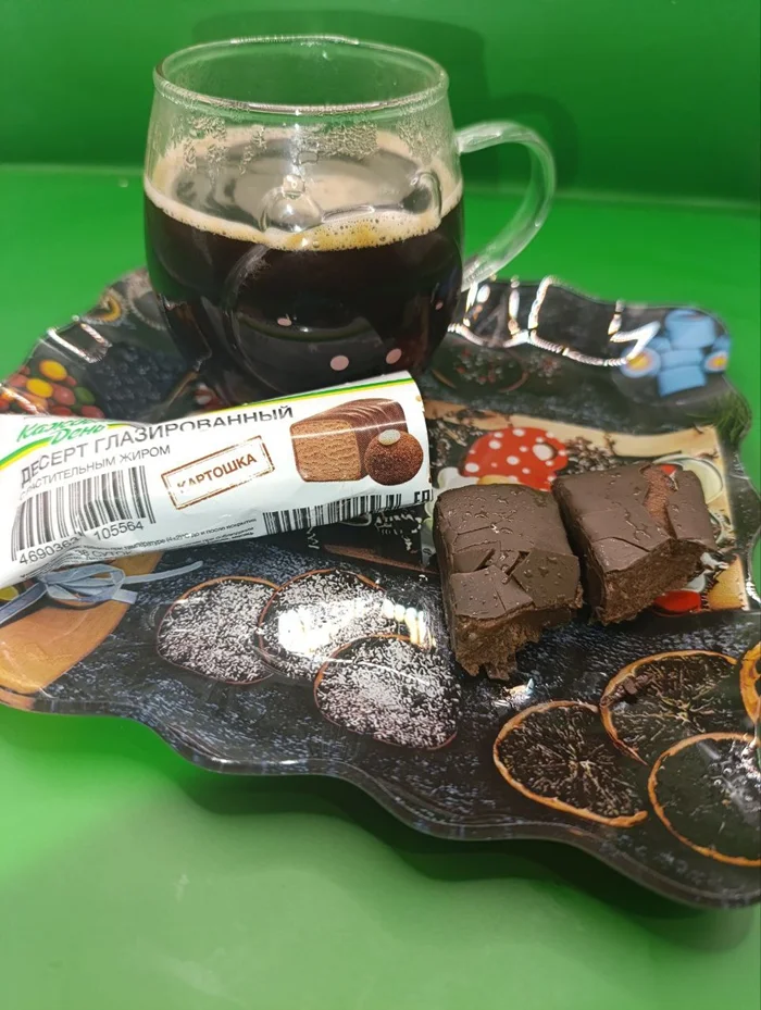 Кофе ароматный, крепкий, вкуснее многих аналогов. Я очень удивилась, но кофе оказался достойным, моя рекомендация. Сырок средний, конечно, есть и лучше сырки-картошки, этот сладкий, зернистый, вкус пирожного-картошки присутствует, с кофе вполне сойдёт, но не ожидайте ничего особенного.