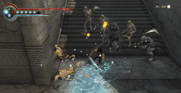 - В-третьих, принц будет периодически перемещаться между двумя временными линиями, и в одной из них его постоянно будет преследовать хранитель времени Дахака, которого нельзя уничтожить. Единственное, что можно будет сделать, это убежать от него, спрятавшись за водной преградой;