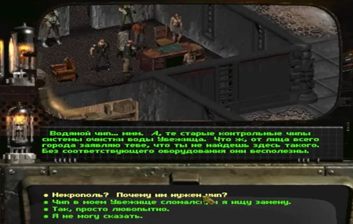 Далее, нужно отправиться к торговцам водой (все в том же Хабе) и купить у них воды для Убежища 13, чтобы продлить себе срок прохождения. Также, торговцы расскажут нам про то, где именно они берут воду. Как оказалось, воду они закупают у гулей в Некрополисе. И мы даже получим координаты этого городо. Собственно, туда нам и надо, ведь именно там находится водный чип (спойлер).