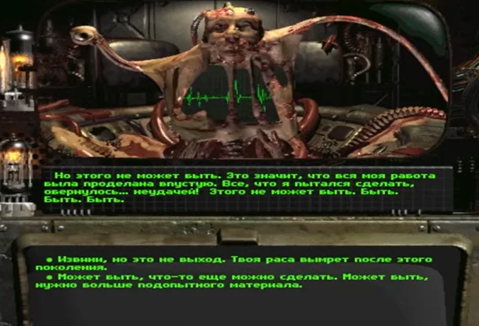 Создатель долго с нами разговаривает, и когда мы говорим ему о том, что супермутанты стерильны, то в начале он нам не верит, и пытается обвинить нас в том, что мы принесли ему подделку в качестве доказательства. Но благодаря красноречию мы убеждаем его в том, что исследования настоящие.