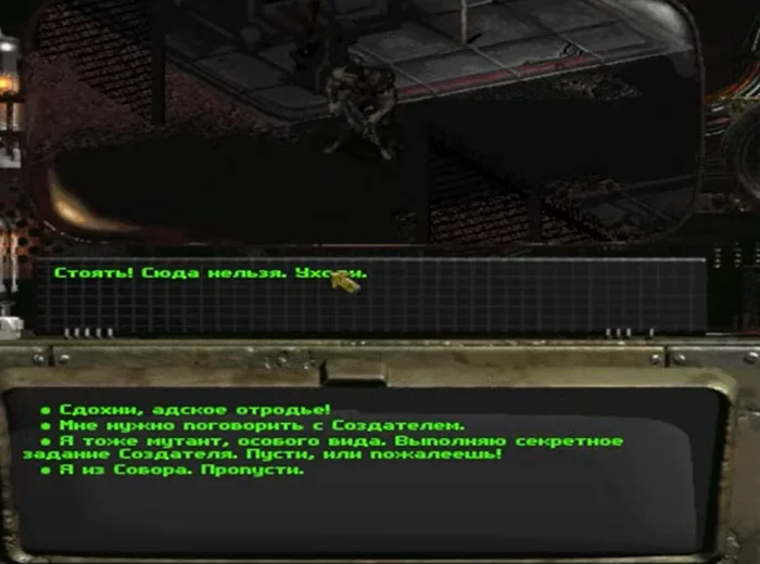 Но когда мы выходим на поверхность к насосу, выясняется, что его охраняют мутанты. Один из них не хочет нас пропускать, так как мы не похожи на гуля. Но благодаря нашему красноречию мы убеждаем туповатого мутанта в том, что наш персонаж является гулем, после чего мы попадаем к насосу и чиним его.