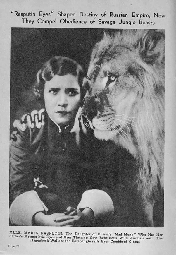 41-летняя Мария Распутина, не долго думая, согласилась. Женщина вспоминала, что ей было страшно входить в клетку со львом. Но после революции и Первой мировой это уже не так сильно пугало.