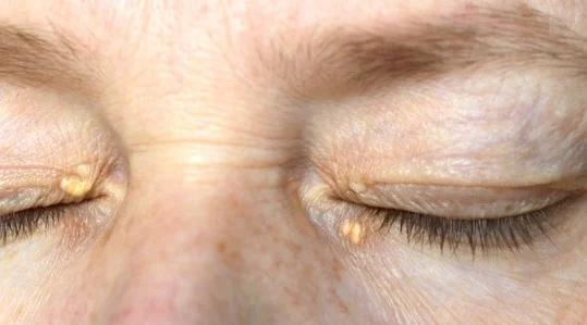 Кстати, чаще всего ксантелазма появляется вокруг глаз. Знаете, почему? Потому что мы постоянно моргаем! Из-за этого капилляры в этой области со временем становятся слабее, и жиру легче через них просочиться.