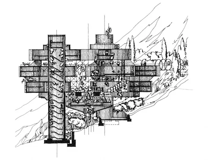 Решение в виде трех погруженных «лап» оправдало себя на 100% — так и нагрузка на склон минимизируется, и внешне пансионат выделяется из числа других. Диаметр каждой колонны — 9 метров, а общая высота здания — 56 метров. Пансионат принимает гостей до сих пор.