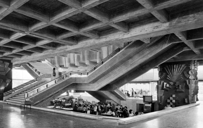 Практически вся основная часть здания поднята над землей, а под ней простираются зеленые зоны (и даже ручей). Дом состоит из пяти больших балок, которые сложены друг на друга как в дженге. Удерживают этот огромный вес ригели внизу, остающиеся без внимания. На момент возведения это выглядело максимально футуристично. Все причастные к проекту по итогу были удостоены премии Совета Министров СССР. Сегодня здание принадлежит Банку Грузии.
