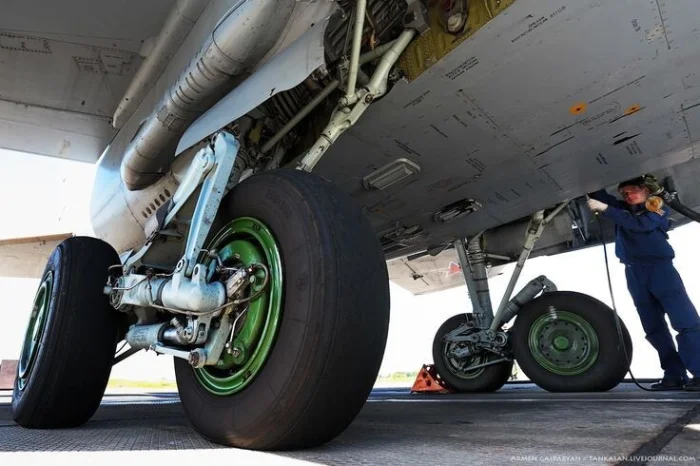 Носовая стойка шасси двухколесная, с грязезащитными щитами. Основные стойки имеют конструкцию тележек, в которых колеса расположены тандемом со смещением относительно продольной оси. Такое шасси значительно снижает давление на грунт, что позволяет эксплуатировать МиГ-31 с грунтовых и ледовых аэродромов (что особенно важно при эксплуатации самолёта в малоосвоенных районах Сибири, где отсутствует развитая аэродромная сеть). Створки ниш основных стоек используются в полёте в качестве отклоняемых на угол 44° тормозных щитков общей площадью 1.39 м2. Они могут быть выпущены даже на сверхзвуковых скоростях.