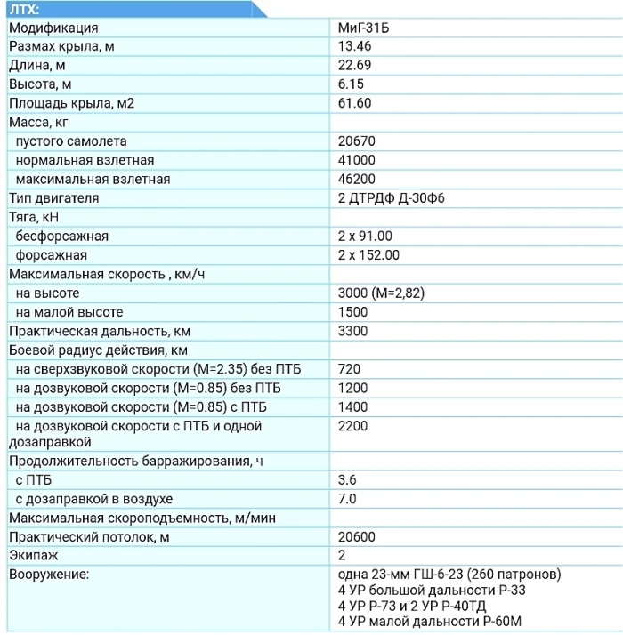 Истребитель МиГ-31 представляет собой дальнейшее усовершенствование перехватчика МиГ-25П. Он разработан для работы в системе противовоздушной обороны страны и способен осуществлять длительное патрулирование, а также эффективно бороться со всеми типами аэродинамических объектов. К ним относятся как малые крылатые ракеты и вертолёты, так и высоколетящие и высокоскоростные самолёты, такие как Lockheed SR-71 или бомбардировщики B-1B. МиГ-31 может выполнять свои задачи в любое время суток, даже в сложных метеоусловиях и при активных действиях по радиоэлектронной борьбе. Этот самолёт фактически является единственным, способным перехватывать и уничтожать крылатые ракеты, которые проходят на минимальных высотах.