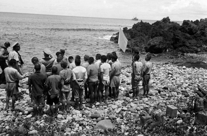 На сушу сошли тридцать человек – двадцать рыбаков и десять солдат. Эти люди прибыли на японском рыболовном судне, которое было переоборудовано для транспортировки боеприпасов. Американские силы разбомбили этот корабль.