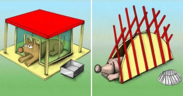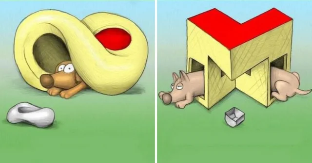 Марко Марилунго — итальянский художник, который умеет доступно разъяснить нюансы архитектуры. Для этого достаточно представить себе собаку, её миску и, конечно же, будку для собаки. Эта простая конструкция служит отличным примером, демонстрируя архитектурные приемы, применяемые известными архитекторами.