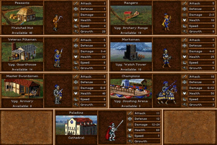 Фракция Рыцаря состоит из тех же юнитов, что и в "двойке". Однако на 4 уровне добавлены арбалетчики, которых можно будет улучшать. Фракция Рыцаря была одной из самых слабых, не только из-за урона юнитов, но и из-за нехватки стрелков и летающих существ. Теперь же у них есть хоть какая-то поддержка.