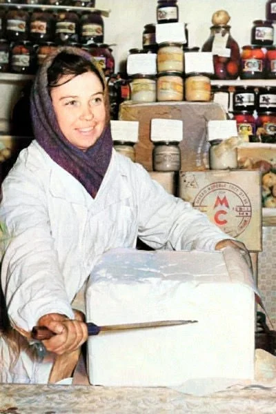 На фотографии изображена Мария Гаврикова, продавец в палатке №2 треста №23. Снимок сделан в 1958 году. В руках у неё нож и большой кусок сливочного масла. На заднем плане видны банки с перловкой, компотом и консервированным рассольником. Наш читатель отметил, что в 70-80-е годы масло начали резать струной, что ускоряло процесс, хотя, по словам знающих людей, струну использовали и раньше.