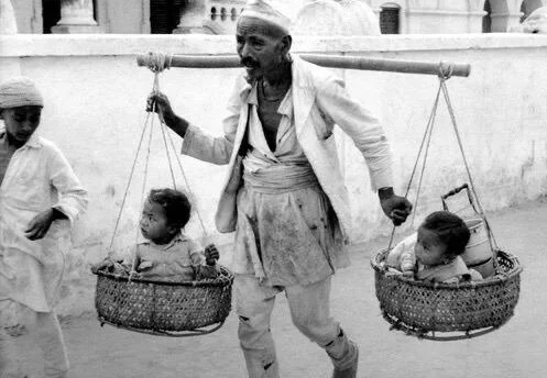 Непал, 1956 год. Отец гуляет с детьми, используя вместо колясок необычное приспособление. Очень находчиво.