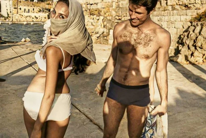 Снимок с пляжа Ливана. Мужчина и женщина в плавках и купальнике, которые были в обиходе в то время.