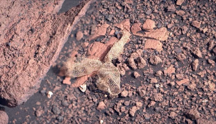 На пути марсохода Perseverance частенько встречаются загадочные обломки. Например, одной довольно любопытной стала сетка, похожая на сброшенную змеиную кожу. Учёные предполагают, что это, вероятнее всего прицепился фрагмент от парашюта, опустившего марсоход с орбиты в нескольких километрах от места посадки.
