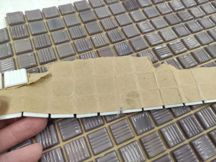 Кажется, что процесс облицовки панелей плитками 2 на 2 см — дело долгое и непростое. Да, процесс был трудоемким, но все же не таким, как многие его представляют. Конечно, никто не клеил элементы по одной штуке. Перед началом работ их закрепляли водно-дисперсионным клеем на листы бумаги. Это называлось «формированием ковровидного материала».