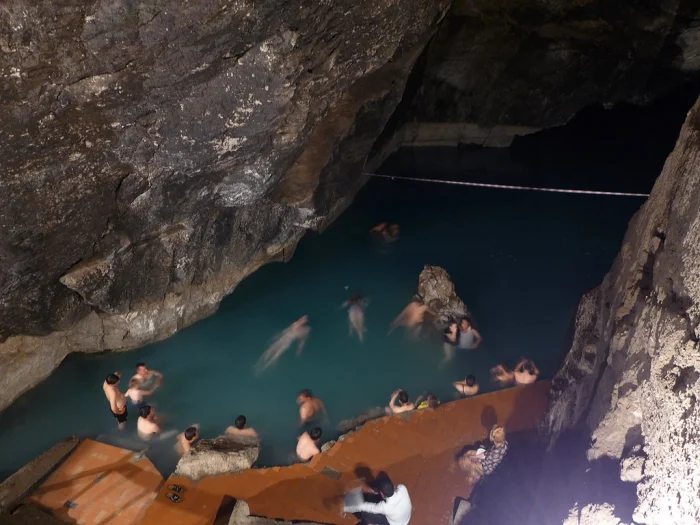 Чтобы попасть к этому озеру (70 метров под землёй), нужно спуститься по длинной лестнице в пещеру Бахарден. Вода здесь тёплая и соленая, а воздух пропитан ароматом серы и помёта тысяч летучих мышей, крупнейшей колонии в Средней Азии.