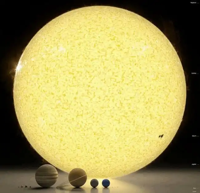 С этого ракурса кольца Сатурна выглядят необычно и напоминают виниловую пластинку. В центре изображения между кольцами Сатурна можно увидеть крошечный спутник Дафнис.