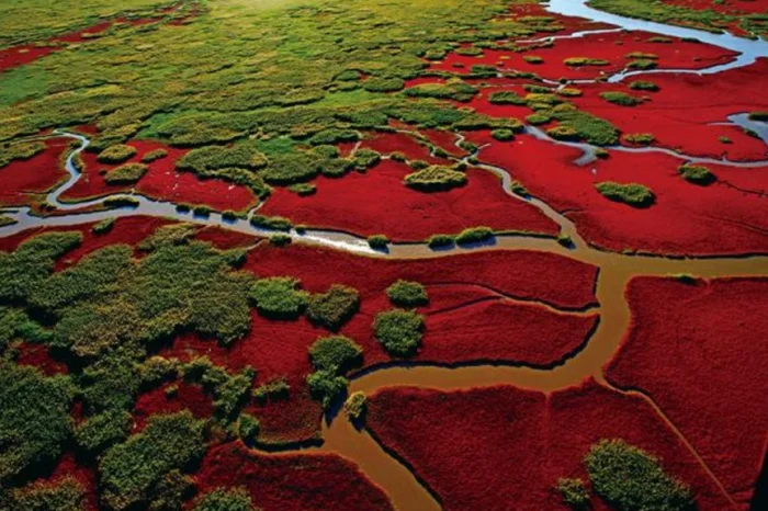 Каждую осень побережье Ляодунского залива превращается в алый ковёр. Это происходит из-за солероса - растения, которое в солёной почве становится ярко-красным. Кроме необычного пейзажа, здесь можно увидеть редких красноголовых журавлей. Туристы гуляют по деревянным мосткам, чтобы не потревожить хрупкую экосистему.