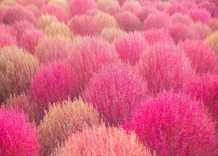 Осенью в Корее поля розовой мухлевой травы (злаковое растение Мюленбергия капиллярная) затмевают даже традиционные клёны. Это растение было завезено из США, но здесь оно разрослось так буйно, что превратилось в туристический хит. Лучшее место для фото - рядом с древней обсерваторией Чхомсондэ.