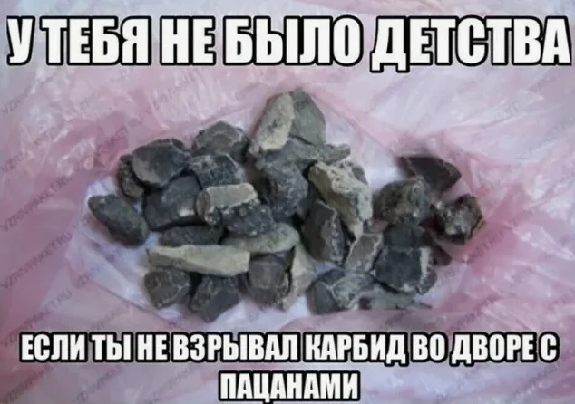 Добыча карбида была непростой задачей, что делало его еще более привлекательным. Обычно его можно было "достать" у знакомого сварщика или найти возле ремонтных мастерских и гаражей. Иногда удачливые ребята собирали крошки на заброшенных стройках, где ранее работали газосварщики.