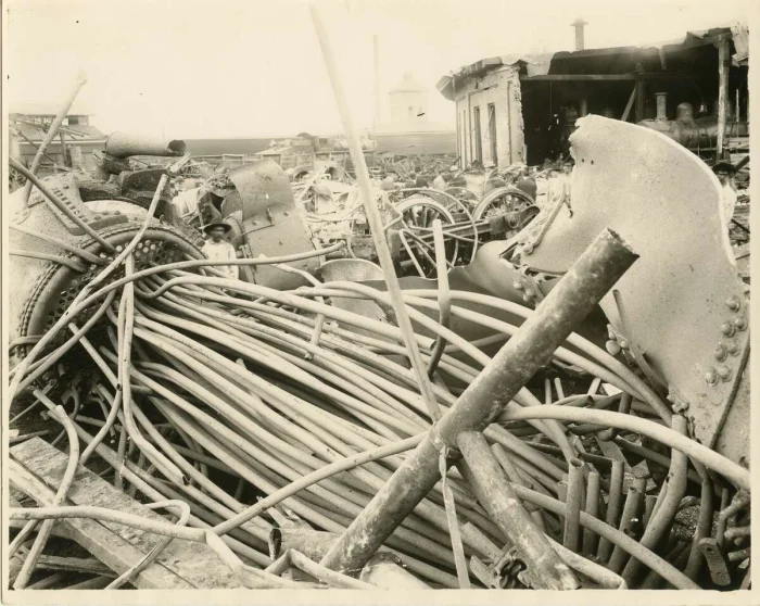 Разрушения, вызванные взрывом котла локомотива в Сан-Антонио штат Техас, в депо "Южная тихоокеанская" принадлежащее компании "Дороги Галвестона, Гаррисберга и Сан-Антонио"