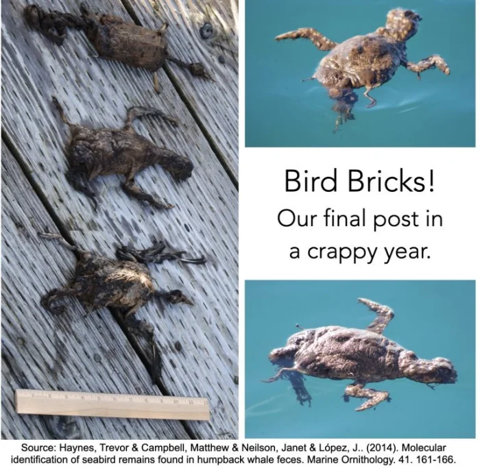 Киты иногда случайно заглатывают птиц во время охоты, но поскольку не могут их переварить, выводят пернатых наружу в практически неизменном виде. Такие образования получили народное название "птичьи кирпичи".