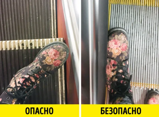 Щетки в основании эскалатора служат защитным барьером, предотвращающим контакт обуви пассажиров с неподвижными элементами конструкции. Однако не все модели эскалаторов обеспечивают полную безопасность – при определенных обстоятельствах нога может быть затянута в механизм. Цветные полосы на ступенях выполняют предупредительную функцию, обозначая безопасную зону для размещения ног.