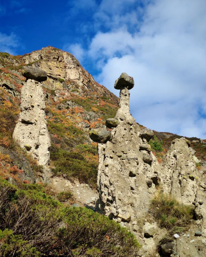 На правом берегу стремительного Чулышмана, в живописном ущелье Карасу, спрятана одна из самых необычных достопримечательностей Алтая — Каменные грибы Аккурума. Эти природные «скульптуры» напоминают гигантские грибы с широкими каменными «шляпками» и кажутся словно созданными руками древних мастеров, хотя на самом деле их формировали ветер, вода и время.