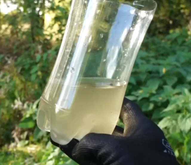 2. Чтобы очистить грязную воду, сделайте простой фильтр из бутылки, мха, травы и камней.
